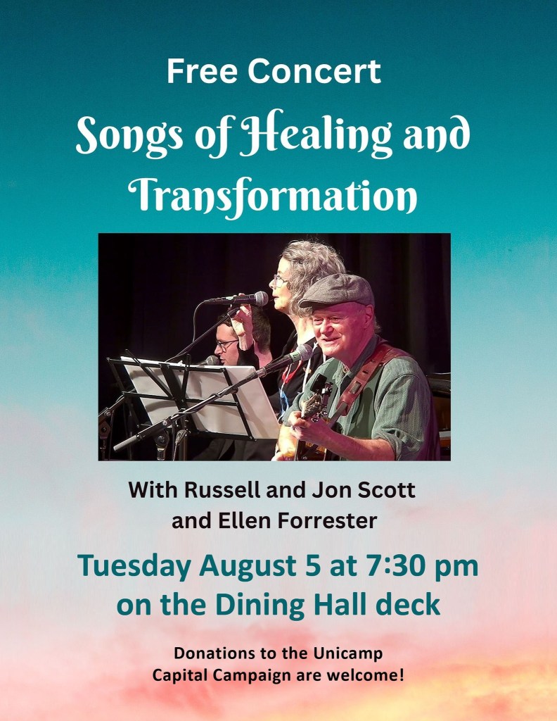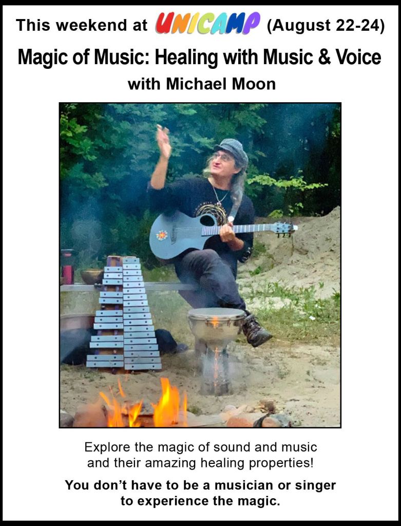 Join Michael and friends as he shares his original music in this special community concert on the program centre deck. Michael Moon is an award winning songwriter and longtime Unicamper. His mystical music takes us through themes of healing, nature and spirit.